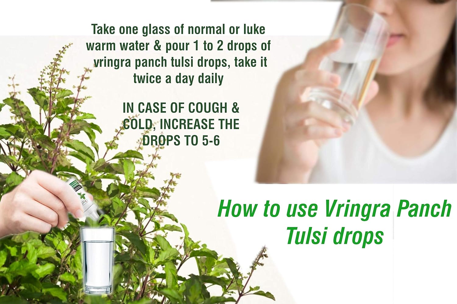 Mix 1-2 drops of Vringra Panch Tulsi in a glass of water, tea, coffee, or milk. Consume 2-3 times daily for a disease-free, healthy life.