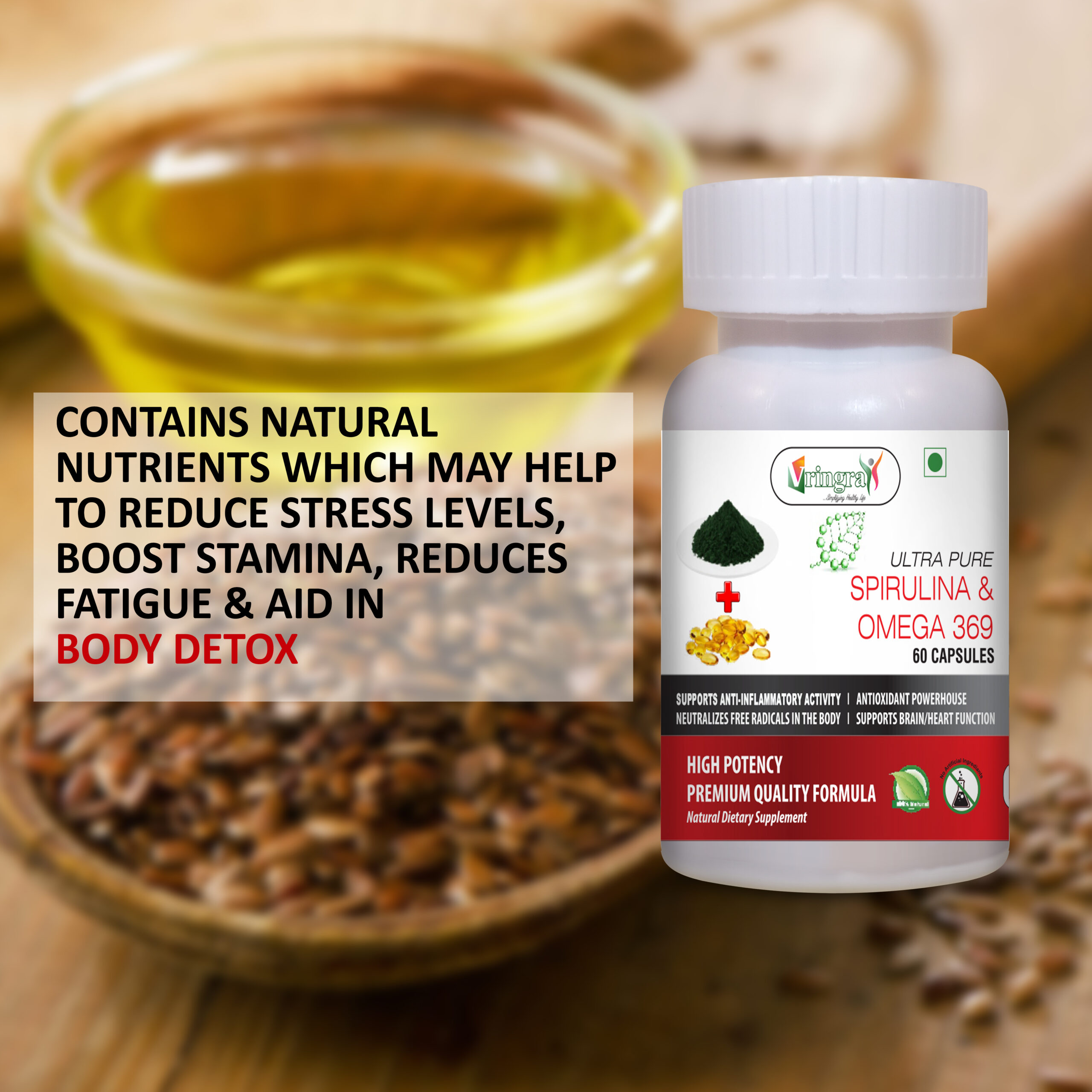 Vringra Spirulina & Omega 3-6-9 is a premium dietary supplement crafted for comprehensive body nourishment. Spirulina is often called a “Miracle from the Sea” because it contains up to 70% digestible complete protein. When paired with the essential fatty acids of Omega 3-6-9, it becomes a complete health system in one capsule.